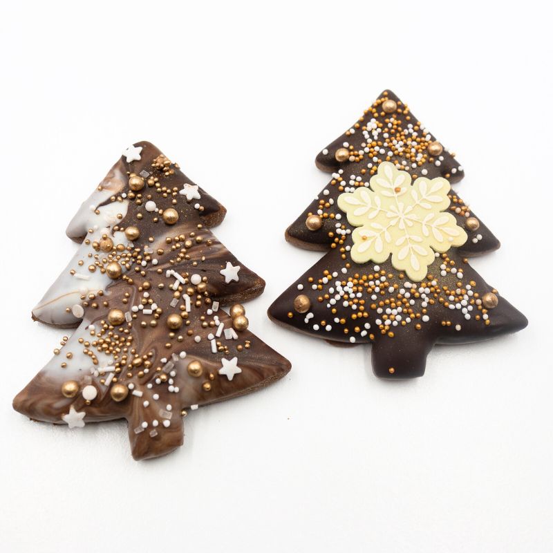 Pierniczki w kształcie choinek, wypiekane według tradycyjnej receptury, mięciutkie i korzenne, oblewane belgijską czekoladą.