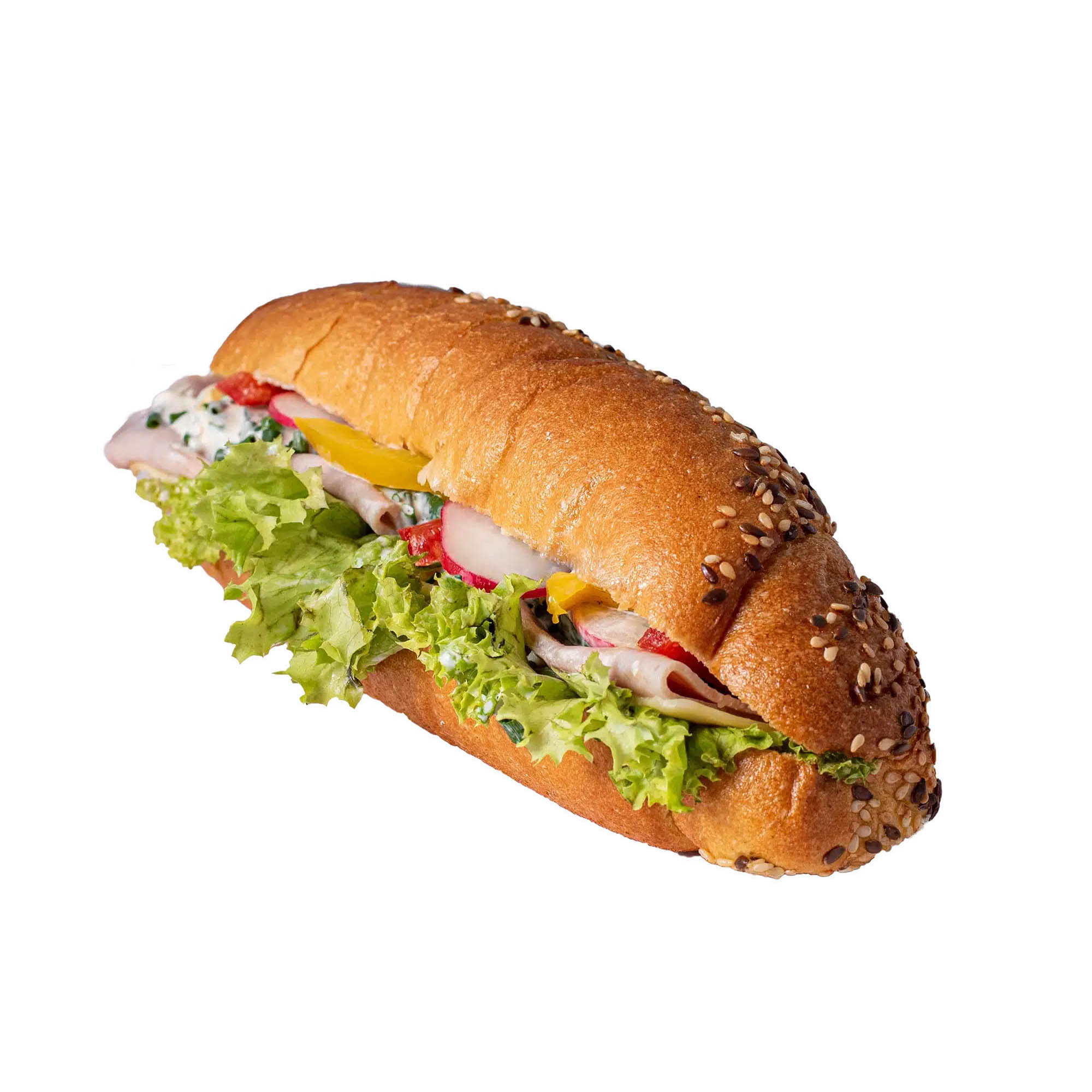 Mięciutka bułka czosnkowa a w niej szynka, żółty ser, jajka, majonez  i świeże warzywa.