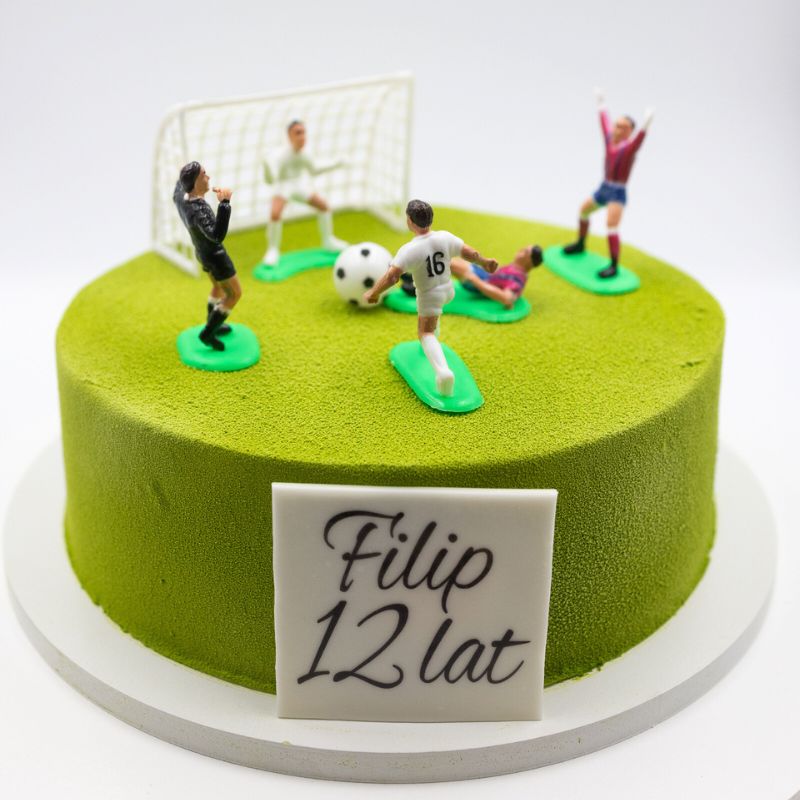 Tort dziecięcy z motywem piłkarskim wykończony masą cukrową, dostępny w ośmiu smakach do wyboru w wadze od 2,0 kg (ok. 15 porcji).